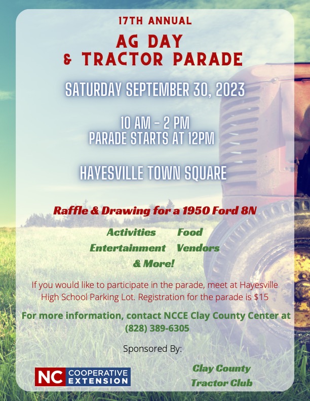 Collapse ▲N.C. Cooperative Extension – Clay County & Clay County Tractor Club will be sponsoring the 17th annual Tractor Parade & Ag Day on Hayesville Town Square. The event will be on September 30 from 10 a.m. – 2 p.m.