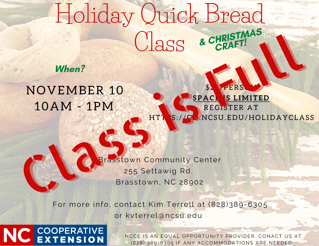 Collapse ▲Join Kim Terrell, FCS Agent, to learn the difference between yeast breads & quick breads. Enjoy a hands on baking experience while sharing holiday quick bread recipes & tasting. The class will also be making a Christmas Wreath. The is a $25/person registration fee to cover material cost.
